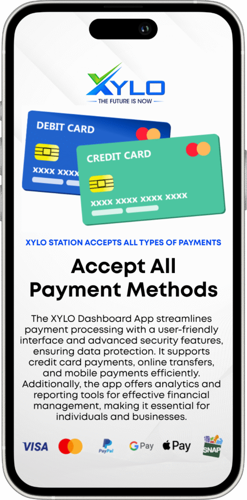 XYLO Station accepts all major cards — Visa, Mastercard, Amex, Discover, plus Apple Pay, Google Pay, contactless (NFC), and EBT. Every transaction syncs instantly to the XYLO Dashboard, giving you live visibility into daily totals, deposits, and performance.